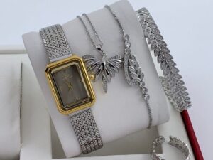اطقم نسائي(ساعه+اكسسوارات زركون فضي)