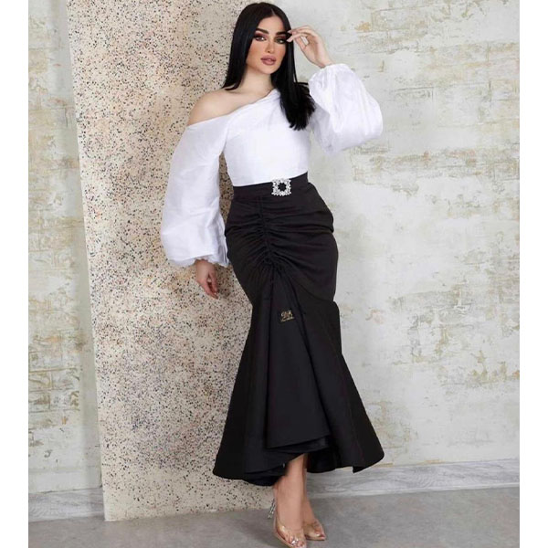 Homeملابسملابس نسائيفساتين نسائيه سهرة فستان ابيض واسود صدريه تفته سله مع كريب استرتش